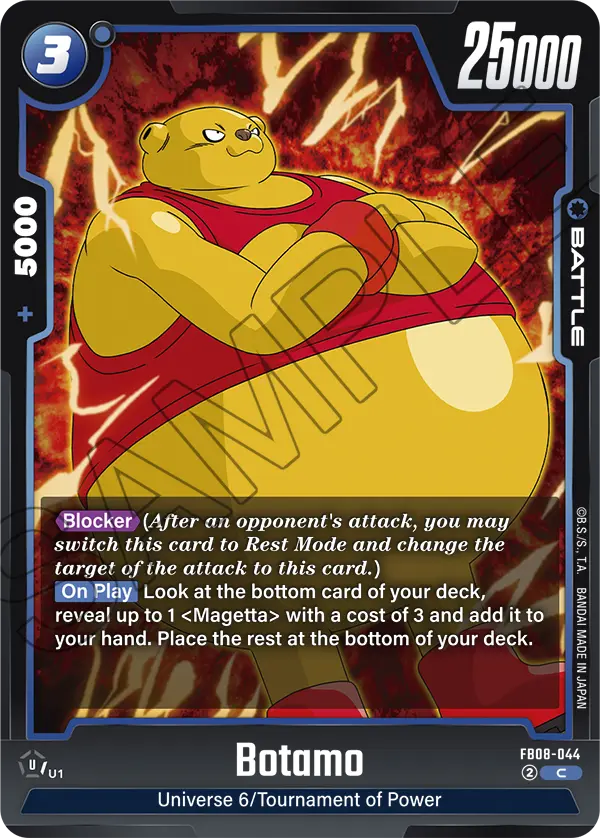 [Blocker] (After an opponent's attack, you may switch this card to Rest Mode and change the target of the attack to this card.) [On Play] Look at the bottom card of your deck, reveal up to 1 "Magetta" with a cost of 3 and add it to your hand. Place the rest at the bottom of your deck.